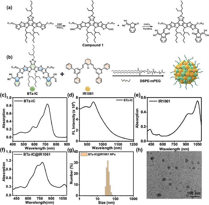 | Fig. 1. (a) The synthetic route of BTz-IC molecule. (b) Schematic diagram of the synthesis of BTz-IC@IR061 nanoparticles. (c) The ultraviolet absorption spectrum of BTz-IC molecule in tetrahydrofuran (THF). (d) The fluorescence spectrum of BTz-IC molecule in THF. (e) The UV absorption spectrum of IR1061 molecule in THF. (f) The ultraviolet absorption spectrum of BTz-IC@IR1061 NPs (in H2O). (g) The DLS of BTz-IC@IR1061 NPs. (h) TEM of BTz-IC@IR1061 NPs. | |