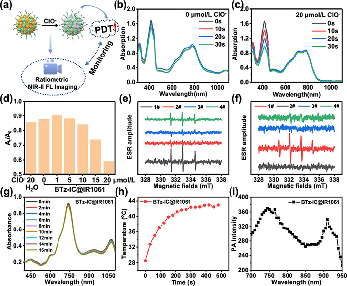 | Fig. 3. (a) Diagram of ClO− activation ratiometric NIR-Ⅱ fluorescence imaging monitoring activation PDT. (b, c) After incubation with nanoprobe at different concentrations of ClO−, absorption changes of DPBF at 415 nm before and after light exposure (concentrations of ClO−: (b) 0 µmol/L, (c) 20 µmol/L)). (d) The absorption ratio of DPBF at 415 nm wavelength after 30 s irradiation and before irradiation after the reaction of nanoparticles with different concentrations of ClO−. (e, f) The ESR spectra of different groups after exposure to 808 nm using TEMP as the 1O2 scavenger (e) and DMPO as the ·OH catcher (f) (1#: BTz-IC@IR1061 + ClO− + 808 nm laser, 2#: H2O + ClO− + 808 nm laser, 3#: H2O + 808 nm laser, 4#: BTz-IC@IR1061 + 808 nm laser) (1 W/cm2, 2 min). (g) Stability of BTz-IC@IR1061 nanoparticles under light conditions (808 nm, 1.0 W/cm2). (h) Temperature curves of BTz-IC@IR1061 solutions under laser irradiation. (ⅰ) Photoacoustic spectra of BTz-IC@IR1061 nanoparticles. | |