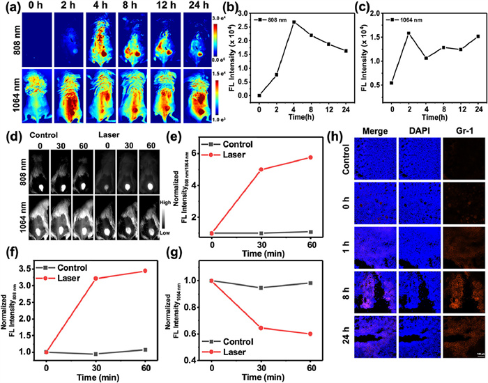 | Fig. 4. (a) NIR Ⅱ fluorescence images of two channels at different time after intravenous injection (i.v.) BTz-IC@IR1061 NPs (Ex: 808 nm, Em > 900 nm; Ex: 1064 nm, Em > 1100 nm). (b) The fluorescence intensity of the 808 nm excitation channel in the tumor region of (a). (c) The fluorescence intensity of the 1064 nm excitation channel in the tumor region of (a). (d) Mice were intratumorally injected with BTz-IC@IR1061 NPs and with different treatment (Control: BTz-IC@IR1061; Laser: BTz-IC@IR1061 + Laser) in different fluorescence channels (Ex: 808 nm, Em > 900 nm; Ex: 1064 nm, Em > 1100 nm). (e) Normalized fluorescence ratio (808 nm/1064 nm) of different groups with different time. (f) Normalized fluorescence intensity curve of different groups with time at 808 nm. (g) Normalized fluorescence intensity curve of different groups with time at 1064 nm. (h) Neutrophil staining of tumor tissues at different times (0, 1, 8, 24 h) after PDT (2-(4-amidinophenyl)−6-indolecarbamidine dihydrochloride (DAPI): λEx: 405 nm; Gr-1: λEx: 640 nm). Scale bar: 100 µm. | |