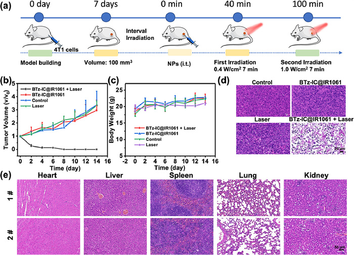 | Fig. 5. (a) Timeline of PDT in mice (intratumoral injection (i.t.)). (b) Tumor growth curves of 4T1 tumor mice after different treatments. (c) Body weight change curve of mice in each group. (d) Tumor H&E sections were stained for 24 h in different groups. Scale bar: 20 µm. (e) After 14 days of treatment, H&E sections of major organs were stained in different groups (1#: Control; 2#: BTz-IC@IR1061 NPs + 808 nm laser). Scale bar: 50 µm. | |