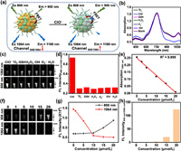 | Fig. 2. (a) Schematic diagram of ClO− response ratiometric fluorescence changes. (b) UV spectrum changes of BTz-IC@IR1061 nanoparticles incubated with different ROS (GSH, H2O2, 1O2, O2·−, ·OH, ClO−. The final concentration was 50 µmol/L). (c) Changes of fluorescence images of BTz-IC@IR1061 nanoparticles incubated with different ROS (GSH, H2O2, 1O2, O2·−, ·OH, ClO−. The final concentration was 50 µmol/L). (d) Changes in fluorescence ratio of 808 nm/1064 nm of BTz-IC@IR1061 nanoparticles incubated with different ROS. (e) Ultraviolet absorption spectra at 1064 nm of BTz-IC@IR1061 nanoparticles reacting with different concentrations of ClO− (0, 2.5, 5, 10, 15, 20 µmol/L). (f) Changes of fluorescence images in the NIR-Ⅱ in different channels after the reaction of BTz-IC@IR1061 nanoparticles with different concentrations of ClO− (0, 5, 7.5, 10, 12.5, 15, 20 µmol/L; Ex: 808 nm, Em > 900 nm; Ex: 1064 nm, Em > 1100 nm). (g) Changes of fluorescence values in two channels after the reaction of BTz-IC@IR1061 nanoparticles with different concentrations of ClO−. (h) Fluorescence ratios of BTz-IC@IR1061 nanoparticles reacting with different concentrations of ClO− (808 nm/1064 nm). | |