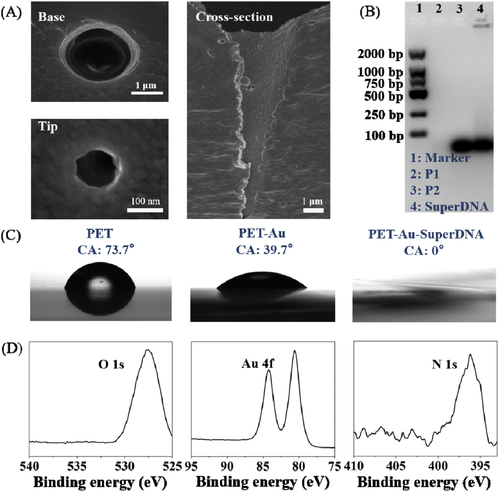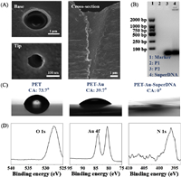 | Fig. 1. Preparation and characterization of the PET-Au-SuperDNA nanochannel. (A) Scanning electron microscopy (SEM) image of the base side, tip side, and cross-section of the etched PET nanochannel. (B) Analysis of HCR products using 2% agarose gel electrophoresis. (C) Surface contact angles of PET, PET-Au and PET-Au-SuperDNA. (D) XPS spectra of PET, PET-Au and PET-Au-SuperDNA. | |