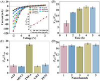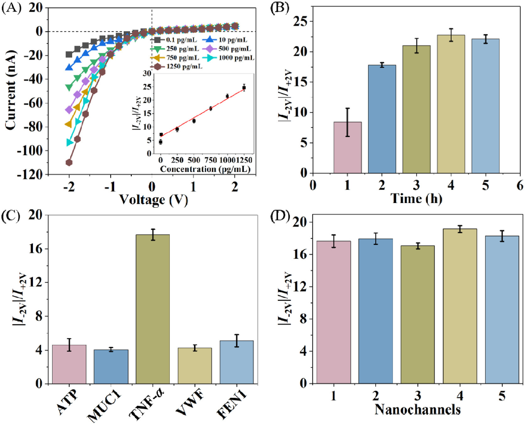 | Fig. 3. (A) I-V properties of the nanochannel toward different TNF-α concentrations. Inset: the corresponding standard work curve. (B) Time dependence for TNF-α and PET-Au-SuperDNA. (C) Selectivity assessment of PET-Au-SuperDNA toward ATP, MUC1, TNF-α, VWF and FEN1. The concentration was 750 pg/mL. (D) The |I−2V|/I+2V of five PET-Au-SuperDNA fabricated independently. | |