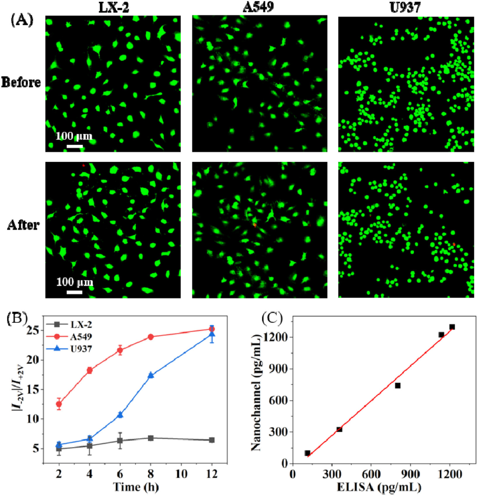 | Fig. 4. (A) The merged CLSM images of cells stained by commercial fluorescence probe FDA (green/live) and PI (red/dead) before and after the operation of insertion and withdrawn from the chamber. (B) The ICR ratio vs. the secretion time with LX-2, A549 cells and M1 macrophages derived from U937 cells in the left chamber. (C) Accuracy verification of the proposed platform. | |