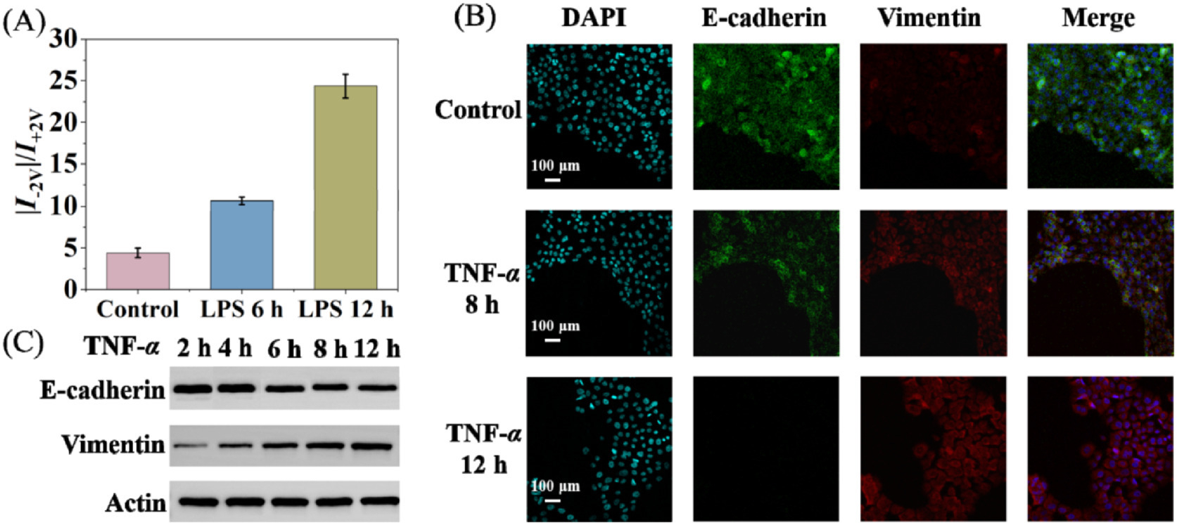 Intercellular communication between tumor associated macrophages (TAMs) and tumor cells is crucial for tumor development, metastasis, and related immune process. As reported, the continuous secretion of TNF-α by TAMs at low doses would induce epithelial mesenchymal transformation (EMT), which is a complex reprogramming process of epithelial cells, playing an important role in tumor invasion and metastasis [35-37]. Our work will mainly investigate whether TNF-α has an effect on EMT. Tumor associated macrophages (U937) and tumor cell (BxPC-3) were used as model, they were cultured on the PET membrane, then rolled up and inserted into the left and right chamber of the self-made device, respectively (Fig. S8 in Supporting information). U937 cells were transformed into M0 macrophages after the incubation of Phorbol 12-myristate 13-acetate (PMA) of 24 h (Fig. S9 in Supporting information), then M0 macrophages were transformed into M1 macrophages to secret TNF-α under the stimulation of LPS. As shown in Fig. 5A, with the extension of LPS stimulation time, the |I−2V|/I+2V was increased compared with the control group due to gradual secretion of TNF-α. Then the effects of TNF-α secretion on BxPC-3 cells were studied. Under immunofluorescence characterization, we found that the expression of EMT marker E-cadherin was down-regulated and the expression of vimentin was up-regulated (Fig. 5B) [38,39]. Western blot further revealed the significant changes in the protein levels of E-cadherin and vimentin at different incubation time (Fig. 5C). These demonstrated that TNF-α induced BxPC-3 cells to achieve a transition from epithelial phenotype to mesenchymal phenotype, a kind of intercellular communication.