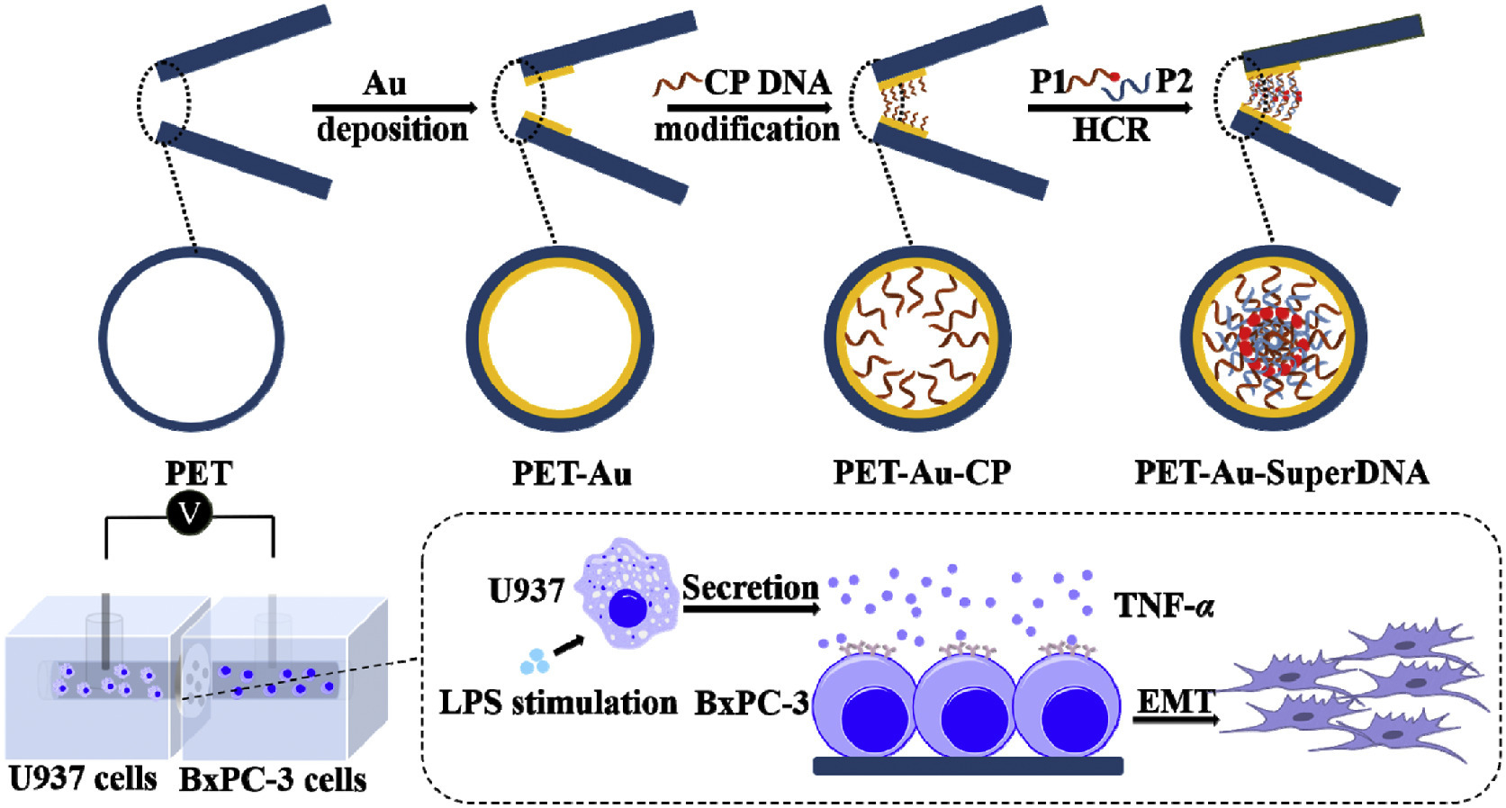 In this work, we fabricated SuperDNA self-assembled conical nanochannel for online detecting living cells released TNF-α and studying intercellular communication (Scheme 1). SuperDNA nanostructures were self-assembled on the tip side of conical nanochannel with the diameter of 137 nm through hybridization chain reaction (HCR). Then the modified nanochannel was clamped in the middle of the self-made device, where polyethylene terephthalate (PET) membrane incubated tumor associated macrophages (differentiated U937) was rolled up and inserted into the left chamber; PET membrane incubated tumor cells (BxPC-3) was rolled up and inserted into the right chamber. Lipopolysaccharides (LPS) was added in the left chamber to stimulate U937 cells to secrete TNF-α, which opened the SuperDNA structure. Through monitoring the ion current change in the nanochannel, living cells released TNF-α could be in situ and noninvasive detected. We achieved a reliable detection limit of 0.23 pg/mL for TNF-α. In addition, the TNF-α mediated intercellular communication between tumor associated macrophages (U937) and tumor cells (BxPC-3) was also investigated. TNF-α induced epithelial-mesenchymal transformation of BxPC-3 cells, which confirmed by down-regulated EMT marker E-cadherin and up-regulated vimentin. Therefore, the proposed platform is expected to be a promising tool for studying cytokines mediated intercellular communication.