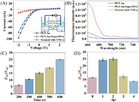 | Fig. 2. (A) I-V plots of the PET-Au, PET-Au-SuperDNA and treated with TNF-α. Inset: section of self-made electrochemical cell. (B) Fluorescence spectrum of the PET-Au, PET-Au-SuperDNA and treated with TNF-α. (C) Optimization of Au deposition time. Error bars represent standard deviations from five repeated measurements. (D) Optimization of electrolyte solution concentration of KCl. | |