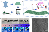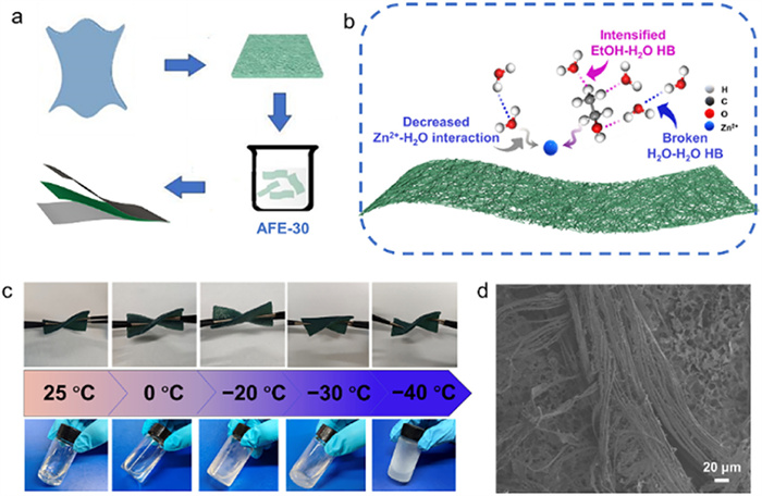 The preparation process of AFLGE-30 is illustrated in Fig. 1a. The leather, produced through a tanning process, retains its collagen fiber structure in the raw cowhide, enhancing collagen fiber dispersion and porosity. The simulated effects of ethanol addition on the molecules and ions within the Zn(OTF)2 solution are illustrated in Fig. 1b. Ethanol molecules replace water molecules and anions around zinc ions in the solution, thus weakening the interaction between zinc ions and water molecules. Moreover, ethanol's freezing point of −114.2 ℃ in the standard state indicates better freezing resistance (Fig. S1 in Supporting information), thereby affecting the physical and chemical properties of the solution.