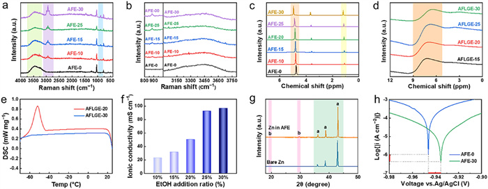 | Fig. 2. (a) Raman curves (b) -OH stretching vibrational peaks of electrolytes containing different proportions of ethanol. 1H nuclear magnetic resonance spectra of (c) liquid electrolytes and (d) gel electrolytes with different ethanol additions. (e) DSC curves of AFLGE-20 and AFLGE-30. (f) Ionic conductivity at −30 ℃ for gel electrolytes with different ethanol contents. (g) XRD curves of zinc foils after immersion in AFE-30 electrolyte for seven days. (h) The corrosion potential of the electrolyte is evaluated in AFLGE-30 electrolyte utilizing a three-electrode system. | |