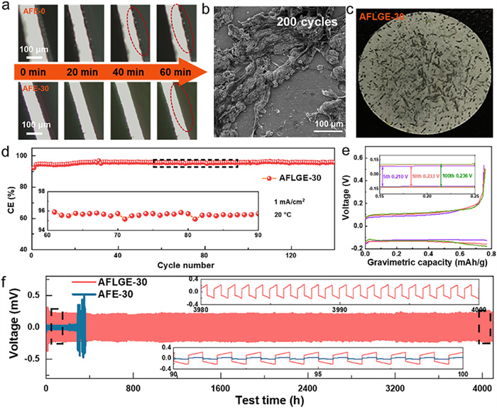 | Fig. 3. (a) In-situ optical microscope observation of the deposition behavior of zinc foil in AFE-0 and AFE-30 liquid electrolytes. (b, c) SEM and optical pictures of AFLGE-30 assembled Zn//Zn symmetric after 200 cycles. (d) Coulombic efficiency of AFLGE-30 assembled Cu//Zn batteries. (e) Capacity-voltage profile during charging and discharging. (f) Long cycle performance of Zn//Zn symmetric batteries assembled with AFLGE-30 and AFE-30 liquid electrolytes. | |