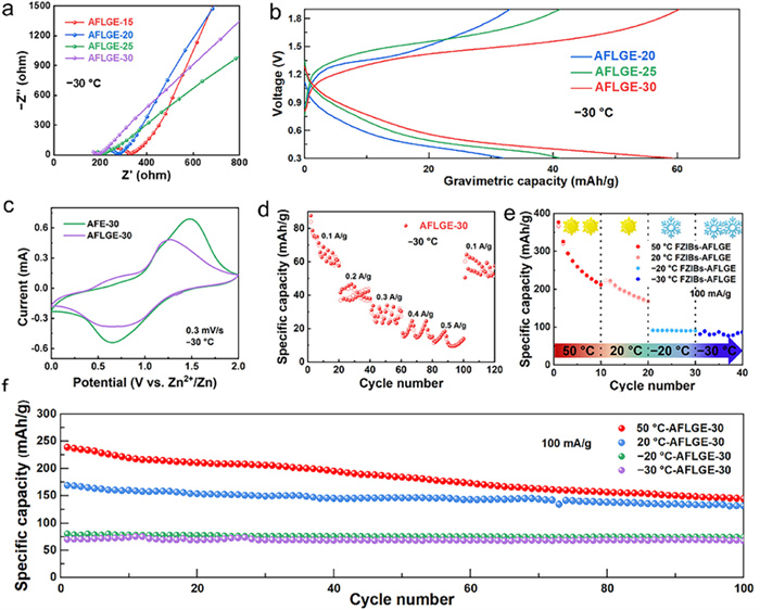| Fig. 4. (a) EIS testing of coin batteries using AFLGE-15, 20, 25 and 30 at −30 ℃. (b) Charge-discharge curves of FZIB using AFLGE-20, 25, 30 at −30 ℃. (c) CV curves of the FZIB using AFLGE-30 and the coin battery using AFE-30 at −30 ℃. (d) Rate capability of FZIB using AFLGE-30 at −30 ℃. (e) Comparison of the FZIB using AFLGE-30 at various temperatures. (f) Long cycle performance at 100 mA/g of the FZIB using AFLGE-30 at various temperatures. | |