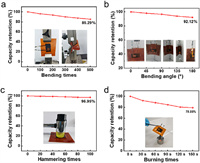 | Fig. 5. Electrochemical properties of the FZIB using AFLGE-30 under different damages: (a) Repeated bending, (b) fixed-angle bending, (c) whacking, and (d) burning. | |