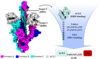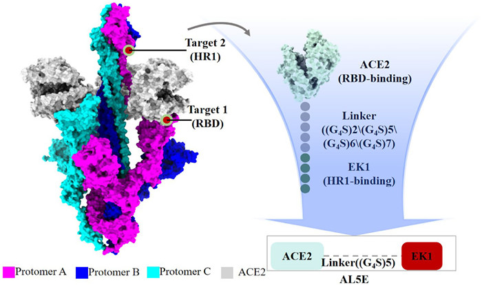 Structural analysis of the E-FIC provided a rationale for the design of dual-functional antiviral agents. The spatial proximity observed between the receptor-binding domain (RBD, target 1) of S1 and the HR1 (target 2) of S2 enables ACE2 to trigger the E-FIC conformation in a cell-free system, allowing the HR1 ligand to bind to HR1 faster than the viral HR2, thereby locking the S protein in the E-FIC state. Building on this, they selected the ACE2 protein, a clinically validated RBD binder, and the HR1-binding EK1 peptide as drug candidates. The two components were then linked via a G4S (Gly-Gly-Gly-Gly-Ser) peptide linker to generate a series of dual-functional drug candidate. Enzyme-linked immunosorbent assay (ELISA) demonstrated that the protein with five linker repeats (AL5E, with a structure of ACE2-(G4S)5-EK1) exhibited optimal binding activity (ACE2: half maximal inhibitory concentration (IC50) = 29.23 nmol/L; HR1: IC50 = 299.5 nmol/L) (Fig. 2).