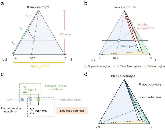 Aiming to translating the experimental observations with ternary S8–Li2S–electrolyte phase diagram into understandings of a working electrochemical LSB system, the authors further correlated phase equilibrium and electrochemical equilibrium by the use of an imaginary inert electrode (Fig. 1c). Key assumptions include the constancy of chemical potential of dissolved S8 at the S8-saturated boundary and the neglect of change in activity coefficient of the blank electrolyte. As a result, any point in the phase diagram is associated with an electrochemical potential and thus the phase diagram can be replotted as an ensemble of isopotential lines (Fig. 1d). The density of these isopotential lines in different regions decreases from the single-phase region, to the S8-saturated two-phase region, and sharply to the Li2S-saturated two-phase region, quantitatively reflecting the voltage decline rate during each discharge stage. This theory establishes a relationship between phase equilibrium and electrochemical equilibrium in LSB, offering a novel paradigm for investigating analogous electrochemical processes involving multiphase transition reactions. Further improvement of such theory is forecasted by incorporating the more complex effects of S8/Li2S/electrolyte mixing and interactions (e.g., solvation, ionic coordination), as well as the variations in activity coefficient. The above improvement may contribute to better understandings of the gel region in the phase diagram, or the behaviors of unconventional electrolytes such those with a high salt concentration.