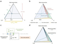| Fig. 1. Schematic illustrations of (a) a ternary S8–Li2S–electrolyte phase diagram and the way of reading the system composition, (b) an experimentally measured ternary phase diagram using a conventional mixed-ether-based blank electrolyte, showing four regions and the paths along which the system and solution points shift upon discharge, (c) the method to correlate chemical equilibrium and electrochemical equilibrium in the LSB using an imaginary inert electrode, and (d) the map of isopotential lines in a LSB phase diagram. Reproduced and adapted with permission [5], Copyright 2024, Springer Nature. | |