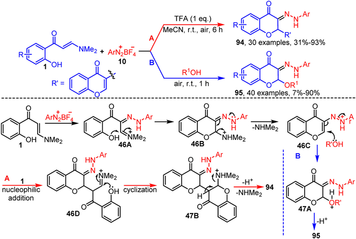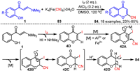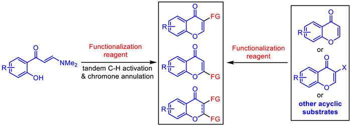 2. Synthesis of 3-carbonizated chromonesOwing to their unique conjugated structural features, the vinyl α-C-H bond of o-hydroxyaryl enaminones is particularly susceptible to electrophilic attack by various carbon electrophiles. This reactivity facilitates chromone annulation, resulting in the formation of 3-carbonizated chromones with significant structural diversity.