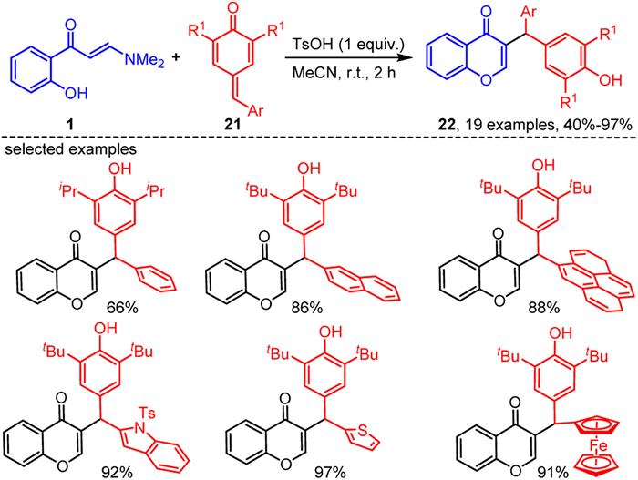 In 2022, by utilizing simple p-quinone methides 21 to react with o-hydroxyaryl enaminones 1 in acetonitrile at room temperature (Scheme 10) [70]. Anand's group observed that the 3-diarylmethylated chromones 22 were successfully and efficiently synthesized through TsOH-mediated 1,6-conjugate addition of enaminones 1 to p-quinone methides 21 followed by intramolecular cyclization. The reaction conditions are mild, and the procedure is straightforward, offering additional options for the industrial synthesis of 3-diarylmethylated chromone-based pharmaceutical molecules.