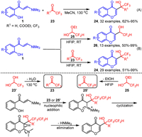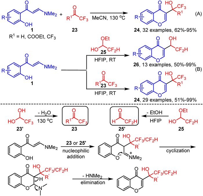 In 2023, Wang and Zuo et al. reported an efficient protocol for the synthesis of 3-trifluoromethyl hydroxymethylated chromones 24 through annulation reactions of o-hydroxyaryl enaminones 1 and trifluoroacetaldehyde/ketone derivatives 23 in acetonitrile at 130 ℃ (Scheme 11A) [71]. The mechanistic study indicates that the reaction likely involves a nucleophilic addition of enaminones 1 to trifluoroacetaldehyde/ketone derivatives 23, followed by intramolecular cyclization and subsequent elimination. Soon thereafter, Yang and Liu et al. established a gentler approach for synthesis diverse 3-difluoromethyl hydroxymethylated chromones 26 and 3-trifluoromethyl hydroxymethylated chromones 24 in HFIP at room temperature through annulation reactions of o-hydroxyaryl enaminones 1 by using difluoroacetaldehyde ethyl hemiacetal 25 and trifluoroacetaldehyde/ketone derivatives 23 as fluorinated coupling partners, respectively (Scheme 11B) [72]. Although this reaction follows a similar mechanism as the previously described one, it operates under milder and more practical conditions. This improvement is primarily due to the use of HFIP, which serves both as the reaction solvent and as a Brønsted acid that provides protons to activate the substrates, thereby lowering the activation energy.
