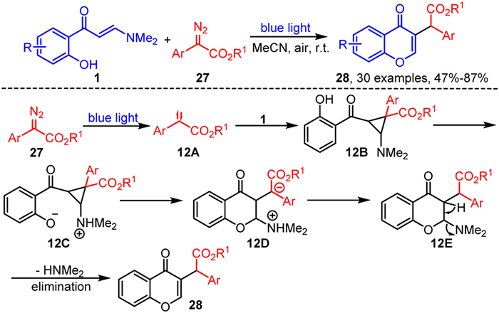 In the same year, Baell and Huang et al. developed an efficient and straightforward strategy for synthesizing 3-alkylated chromones 28 from o-hydroxyaryl enaminones 1 and α-diazo esters 27 under visible light irradiation (Scheme 12) [73]. This eco-friendly approach is characterized by a broad substrate scope, the absence of catalysts and additives, and good functional group tolerance. Based on experimental results and DFT computations, a plausible reaction mechanism was proposed. Initially, under blue light irradiation, α-diazo esters 27 decompose to release a molecule of nitrogen, generating a singlet carbene intermediate 12A. This intermediate then reacts with enaminone 1 to form the cyclopropane intermediate 12B, which rapidly undergoes intramolecular proton transfer to yield intermediate 12C. Intermediate 12C subsequently cyclizes to form intermediate 12D. Finally, 12D undergoes intramolecular proton transfer and spontaneous elimination of dimethylamine to produce 3-alkylated chromone 28.