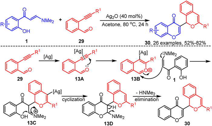 In 2022, Yu's group reported a silver-catalyzed tandem annulation reaction of o-hydroxyaryl enaminones 1 for the regioselective synthesis of 3-(1H-isochromen)-chromones 30, employing o-alkynylbenzaldehydes 29 as the carbon coupling partners (Scheme 13) [74]. This protocol demonstrates excellent regioselectivity and high bond-forming efficiency, facilitating the self-assembly of 1H-isochromene and chromone into a unified structure. The proposed reaction mechanism initiates with the activation of o-alkynylbenzaldehydes 29 by Ag₂O to generate intermediate 13A. This intermediate then undergoes a 6-endo-dig cyclization to form the intermediate 13B. Subsequently, intermediate 13B reacts with an enaminone 1 through nucleophilic addition to produce intermediate 13C. Finally, intermediate 13C undergoes intramolecular cyclization to yield 13D, which then eliminates dimethylamine to produce the target product 30.