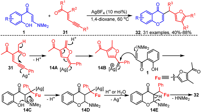 More recently, the same research group developed a tandem C–H bond alkylation and chromone cyclization reaction catalyzed by AgBF4, involving o-hydroxyaryl enaminones 1 and enynones 31 for the synthesis of 3-furylmethyl chromones 32 (Scheme 14) [75]. In this reaction, AgBF4 first activates enynone 31, resulting in the loss of a proton and formation of the five-membered ring intermediate 14A. Intermediate 14A then reacts with a proton to generate the silver carbene intermediate 14B. Subsequently, enaminones 1 undergo nucleophilic addition to intermediate 14B, producing intermediate 14C, which then undergoes intramolecular cyclization to form intermediate 14D. Finally, intermediate 14D is protonated and the silver catalyst is lost, yielding intermediate 14E, which is further converted to the final product 32 through the elimination of dimethylamine.