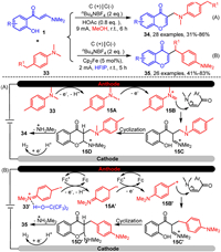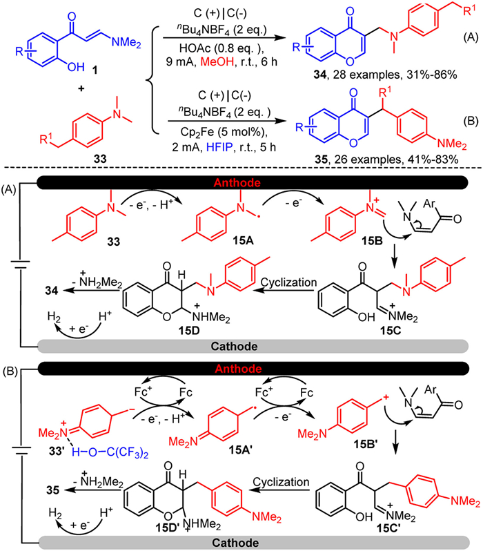 In 2024, He's group developed a novel electrochemical catalytic approach for the regioselective synthesis of 3-alkylated chromones 34 and 35 (Scheme 15) [76]. This method involves tandem C–H bond alkylation of o-hydroxyaryl enaminones 1 and p-alkyl-substituted N,N-dimethylanilines 33, followed by chromone cyclization. Notably, the regioselectivity of the reaction is predominantly influenced by the choice of solvent. Methanol and HFIP (hexafluoroisopropanol) selectively activate the C(sp3)-H bonds at the ortho position relative to the nitrogen and at the benzylic position in substrate 33, respectively. Based on mechanistic experiments, the authors proposed a plausible reaction mechanism. Firstly, in the presence of methanol as the solvent (Scheme 15A), N,N, 4-trimethylaniline 33 undergoes two single-electron oxidations at the anode and loses a proton to form iminium ion 15B via the alkyl radical intermediate 15A. In contrast, when HFIP is used as the solvent (Scheme 15B), intermolecular hydrogen bonding between the hydroxyl group of HFIP and the nitrogen atom of 33 leads to the double oxidation of the methyl group on the aryl ring, resulting in the formation of alkyl carbocation 15B'. Subsequently, intermediates 15B and 15B' undergo electrophilic addition to enaminones 1, yielding iminium ions 15C and 15C', respectively. Finally, iminium ions 15C and 15C' undergo intramolecular nucleophilic cyclization and elimination of dimethylammonium cation, producing the final products 34 and 35, respectively.