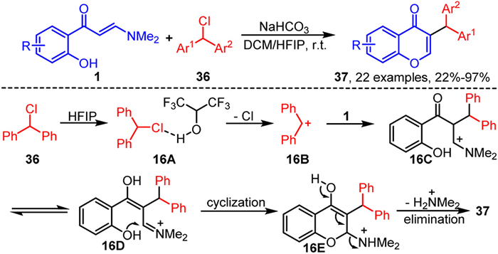 In 2024, Yang and colleagues reported an HFIP-promoted tandem cyclization of halohydrocarbons 36 with o-hydroxyaryl enaminones 1, providing a streamlined approach for synthesizing 3-alkylchromone derivatives 37 (Scheme 16) [77]. HFIP is indispensable in this reaction, playing dual a role as both solvent and hydrogen bond donor, which significantly enhances the reaction efficiency. Mechanistic investigations reveal that HFIP forms an intermolecular hydrogen bond with the chlorine atom in alkyl chloride 36, facilitating chloride departure and generation of the carbocation intermediate 16B. This intermediate subsequently undergoes electrophilic addition with enaminone 1 to yield intermediate 16C, which tautomerizes to form the imine intermediate 16D. Subsequent intramolecular cyclization and elimination of a dimethylamine cation yield the desired product 37.