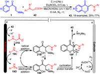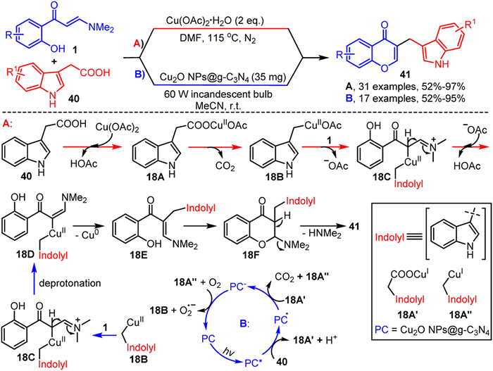 In recent years, several research groups have advanced numerous decarboxylation strategies for the tandem alkylation-cyclization of o-hydroxyaryl enaminones, enabling the efficient construction of structurally diverse 3-alkylated chromone derivatives. For example, Tang, Yang et al. [79] and Shrivastav, Sharma et al. [80] have employed transition metal-mediated and photocatalytic methods, respectively, to achieve the tandem decarboxylative alkylation-cyclization of o-hydroxyaryl enaminones 1 and 3-indoleacetic acids 40 (Scheme 18). Mechanistic studies suggest two distinct reaction pathways. In pathway A, 3-indoleacetic acid 40 reacts with copper acetate to form intermediate 18A, which subsequently undergoes CO2 elimination to produce intermediate 18B. In pathway B, 3-indoleacetic acid 40 interacts with an excited-state photocatalyst to form 18A', which then undergoes decarboxylation to yield intermediate 18A''. This intermediate is further oxidized by oxygen via single-electron transfer to generate intermediate 18B. In both pathways, 18B reacts with enaminone 1 to form intermediate 18C, which then undergoes deprotonation to yield intermediate 18D. Finally, 18D undergoes reductive elimination, intramolecular nucleophilic cyclization, and elimination of dimethylamine to produce the final product 41.