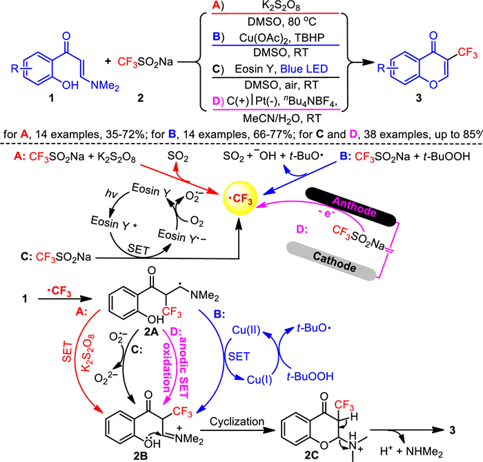 More recently, the Li's group developed both photochemical (Scheme 2C) and electrochemical (Scheme 2D) strategies to promote the tandem trifluoromethylation-cyclization of o-hydroxyaryl enaminones 1, enabling the efficient synthesis of 3-trifluoromethylchromones 3 [57]. These approaches demonstrate high substrate compatibility with enaminones 1, and both sodium trifluoromethanesulfinate and sodium perfluoroalkanesulfinates are compatible as fluorine sources within the reaction system. Mechanistic investigations suggest a pathway involving both radical and iminium ion intermediates. In the photochemical approach, visible-light irradiation excites the photosensitizer to an active state Eosin Y*, which then participates in single-electron transfer with sodium trifluoromethanesulfinate to produce a trifluoromethyl radical and the reduced form of Eosin Y (Eosin Y·-). Eosin Y·- is subsequently reoxidized by oxygen, regenerating the photosensitizer Eosin Y and producing O2·- species to complete the photocatalytic cycle. In the electrochemical approach, the CF3SO2Na 2 undergoes direct anodic single-electron oxidation to form the trifluoromethyl radical. This radical initiates an electrophilic attack on enaminone 1, yielding intermediate 2A. Intermediate 2A is then oxidized to the iminium intermediate 2B, either by O2·- species in the photochemical method or by anodic oxidation in the electrochemical method. The iminium intermediate 2B undergoes intramolecular cyclization to generate intermediate 2C, which then following deprotonation and elimination of dimethylamine, yields the target product 3.