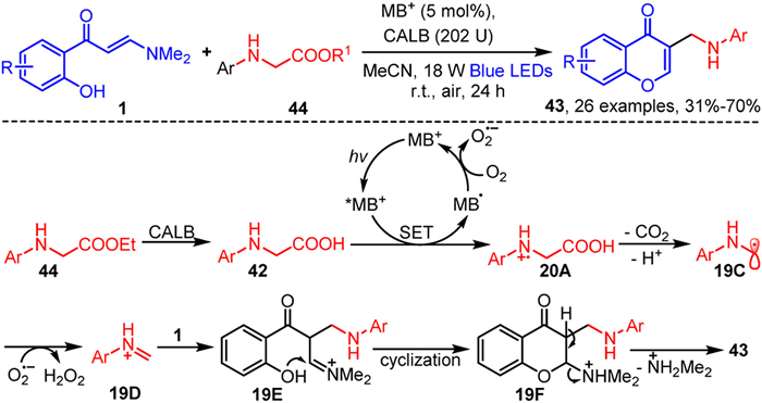 In the same year, Zhu's group integrated photochemical and enzymatic catalytic strategies, utilizing methylene blue (MB) as the photocatalyst and Candida antarctica lipase B (CALB) as the enzyme catalyst, to develop a novel tandem enzymatic decarboxylative alkylation-cyclization reaction of o-hydroxyaryl enaminones 1 with N-arylglycine esters 44, resulting in the synthesis of 3-aminoalkylated chromones 43 (Scheme 20) [82]. Based on control experiments, a plausible reaction mechanism was proposed. As depicted in Scheme 20, in the presence of enzymatic catalysis, N-arylglycine esters 44 undergo hydrolysis to yield N-arylglycine 42. The resulting 42 is then subjected to single-electron oxidation by an excited-state photocatalyst derived from methylene blue (MB) under light irradiation, forming 20A. Intermediate 20A subsequently undergoes deprotonation and CO₂ elimination to generate 19C, which is further oxidized to the iminium ion 19D. The iminium ion 19D then reacts with enaminone 1 to form 19E, which undergoes intramolecular cyclization and elimination of the dimethylammonium cation, ultimately producing the final product 43.