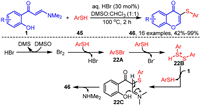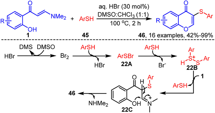 3.1. Synthesis of 3-sulfenylated chromonesIn 2019, Maddani's group developed a convenient strategy for the selective cascade thiolation-cyclization of o-hydroxyaryl enaminones 1 and arylthiols 45 using a combination reagent of HBr and DMSO. This approach efficiently synthesized a series of 3-arylthiochromone derivatives (Scheme 22) [87]. Comprehensive mechanistic studies revealed that the acid not only facilitated the in situ formation of disulfides but also enhanced the electrophilicity of the sulfur atoms in the disulfide through protonation. Initially, bromide ions were oxidized to elemental bromine by DMSO in an acidic medium, which then reacted with arylthiols 45 to form intermediate 22A. Subsequently, intermediate 22A reacted further with arylthiols 45 in the acidic environment to yield the disulfide cationic intermediate 22B. Enaminones 1 then underwent nucleophilic addition to intermediate 22B, resulting in the formation of intermediate 22C. This intermediate subsequently underwent intramolecular nucleophilic cyclization and elimination of the dimethylamine to produce the target compound 46.