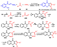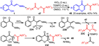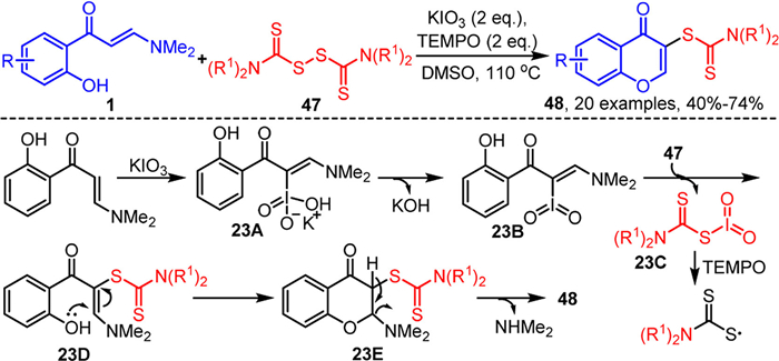In 2021, our group demonstrated a tandem dithiocarbamation-cyclization reaction of o-hydroxyaryl enaminones 1 with thiurams 47 catalyzed by KIO3 and TEMPO, leading to the synthesis of 3-dithiocarbamyl chromones 48 (Scheme 23) [88]. The reaction proceeds with the addition of enaminones 1 to the I=O bond in KIO3, forming intermediate 23A, which then undergoes elimination of KOH to form intermediate 23B. Subsequently, intermediate 23B reacts with thiurams 47 to generate intermediate 23D, while simultaneously releasing a molecule of 23C. Finally, 23D undergoes intramolecular nucleophilic cyclization to form 23E, and dimethylamine is eliminated to produce the target compound 48. It is noteworthy that TEMPO plays a critical role in enhancing the reaction efficiency. This enhancement is primarily attributed to TEMPO's ability to scavenge 23C, a byproduct that significantly impedes the formation of 23D. By effectively removing 23C from the reaction milieu, TEMPO facilitates the progression and overall yield of the reaction.