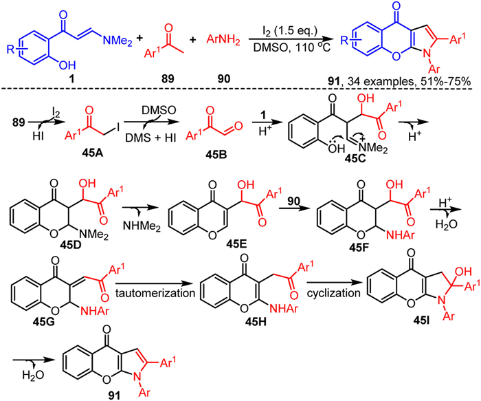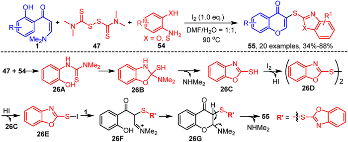 After our work, the Dong group similarly utilized an iodine-promoted strategy to achieve a three-component tandem cyclization reaction of o-hydroxyaryl enaminones 1, tetramethylthiuram disulfide 47, and 2-amino-/aminothiophenols 54, efficiently synthesizing S-benzoazolyl/benzothiazolyl chromone derivatives 55 (Scheme 26) [91]. First, 2-aminophenols 54 undergoes nucleophilic substitution with tetramethylthiuram disulfide 47, to generate intermediate 26A, which then undergoes intramolecular nucleophilic addition and dimethylamine elimination through intermediate 26B to form intermediate 26C. Two molecules of 26C undergo dehydroiodination in the presence of iodine to produce intermediate 26D, which then reacts with HI to form the more reactive intermediate 26E. Intermediate 26E undergoes SN2-type nucleophilic substitution with enaminones 1 to yield intermediate 26F, which then undergoes intramolecular nucleophilic cyclization, deprotonation, and dimethylamine elimination through intermediate 26G to obtain the target product 55.