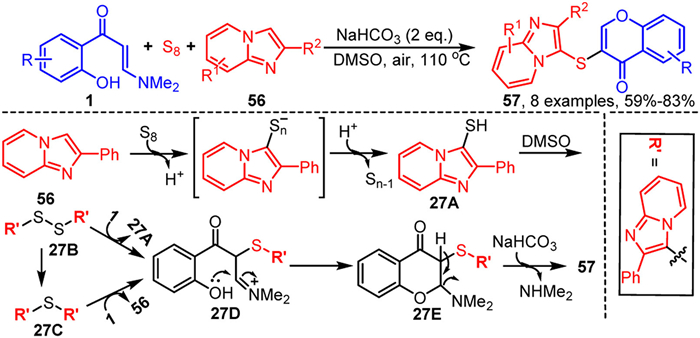 Meanwhile, Zhu and collaborators utilized elemental sulfur as the sulfur source to achieve consecutive tandem vinyl α-C-H bond sulfenylation and cyclization reactions of o-hydroxyaryl enaminones 1 with imidazopyridines 56, for the synthesis of potentially bioactive 3-(imidazo[1,2-a]pyridin-3-ylthio)-chromones 57 (Scheme 27) [92]. The reaction requires only base promotion, without the involvement of transition metals or other additives, and occurs under mild conditions. Imidazopyridines 56 initially undergo oxidative homocoupling under the combined action of the base, elemental sulfur, and DMSO, resulting in the disulfide intermediate 27B through intermediate 27A. Intermediate 27B can then proceed via two distinct pathways to generate 27D: (1) the addition to enaminones 1 with the elimination of 27A, or (2) through the thioether intermediate 27C, followed by addition to enaminones 1 with the elimination of 56. Finally, 27D undergoes chromone cyclization, deprotonation, and dimethylamine elimination via intermediate 27E to produce the target product 57.