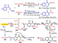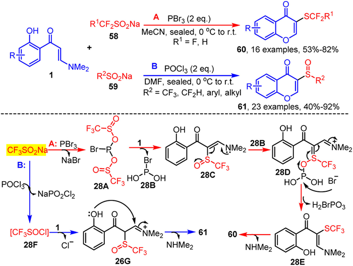 In 2024, our group developed a divergent and controllable tandem vinyl α-C-H bond functionalization and chromone cyclization reaction of o-hydroxyaryl enaminones 1 with sodium organosulfinate as the sulfurizing reagent. Utilizing PBr3 and POCl3 as deoxygenating agents, this method enabled the construction of structurally diverse 3-di/trifluoromethyl-thiochromones 60 and 3-sulfoxylated chromones 61, respectively (Scheme 28) [93]. This strategy operates under mild reaction conditions without the need for transition metal catalysts and demonstrates excellent functional group compatibility with various substrates. Notably, CF2HSO2Na and CF3SO2Na are effective for the synthesis of 3-functionalized chromones 60 and 61. Furthermore, sodium arylsulfinates and sodium alkylsulfinates can also be utilized for the synthesis of 3-aryl/alkylsulfinyl chromones 61. Mechanistic studies demonstrate that in the reaction where PBr3 serves as the dehydrating agent (Scheme 28A), CF3SO2Na initially interacts with PBr3 to generate intermediate 28A. This intermediate subsequently undergoes electrophilic substitution with enaminone 1, yielding intermediate 28C and releasing 28B. Following this, 28C participates in an SN2-type reaction with 28B, forming intermediate 28D. The presence of a bromide ion facilitates electron transfer between the phosphorus and oxygen atoms in 28D, leading to the cleavage of the S-O bond and the formation of intermediate 28E. This intermediate then undergoes classical chromone cyclization, followed by the elimination of dimethylamine, to afford the desired product 60. In the alternative reaction pathway employing POCl3 as the dehydrating agent (Scheme 28B), CF3SO2Na reacts with POCl3 to form intermediate 28F, which then reacts with enaminone 1 to yield imine intermediate 28G. The intermediate 28G undergoes subsequent intramolecular nucleophilic cyclization and deamination, resulting in the formation of the target product 61.