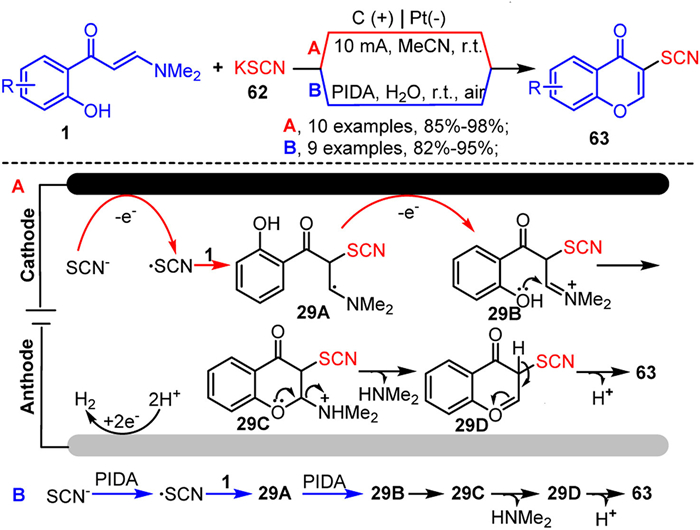 The thiocyano group, a typical sulfur-containing functional group, has garnered extensive attention for its unique physicochemical properties and potential for further organic transformations [94–96]. Recent advances have been made in introducing the thiocyanate group into the chromone framework, resulting in the construction of 3-thiocyanated chromone derivatives through more efficient and greener methods, such as the vinyl α-C-H bond thiocyanation and cyclization reactions of enaminones. For instance, in 2019, Zhou and collaborators utilized KSCN 62 as a thiocyanation reagent to achieve the tandem thiocyanation-cyclization reaction of o-hydroxyaryl enaminones 1 via both electrochemical synthesis [97] and PIDA (iodobenzene diacetate)-promoted [98] strategies, thereby efficiently synthesizing 3-thiocyanated chromone derivatives 63 (Scheme 29). Mechanistic studies suggest that both strategies involve a common iminium ion intermediate 29B, although the pathways to this intermediate differ slightly. As shown in Scheme 29, in pathway A, the thiocyano anion undergoes single-electron oxidation at the anode to form a thiocyano radical, which then adds to enaminones 1 and undergoes further single-electron oxidation to yield the iminium ion 29B through the radical intermediate 29A. In pathway B, the thiocyano anion is oxidized by PIDA to form a thiocyano radical, which subsequently adds to enaminones 1 to generate the intermediate 29A, followed by additional oxidation by PIDA to produce the iminium ion 29B. Ultimately, 29B undergoes intramolecular cyclization, dimethylamine elimination, and deprotonation through intermediates 29C and 29D to form the target product 63.