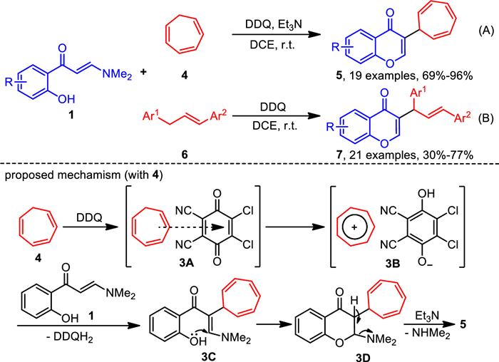 2.2. Synthesis of 3-allylated chromonesRecently, Cheng and co-workers developed a convenient DDQ-promoted cascade intermolecular oxidative coupling and annulation reaction of o-hydroxyaryl enaminones 1, utilizing cycloheptatriene 4 (Scheme 3A) [58] and 1,3-diarylpropenes 6 (Scheme 3B) [59] as allylation reagents, for the synthesis of corresponding 3-allyl chromones 5 and 7, respectively. These reactions proceed via the key intermolecular interaction between DDQ and the allylation reagent, generating an ion-pair intermediate, which could couple the vinyl α-C-H bond in enaminones 1. For example, in the reaction using cycloheptatriene 4 as the allylation reagent, it interacts with DDQ to form a charge-transfer complex 3A, followed by the formation of the key ion-pair intermediate 3B via hydride transfer. Subsequently, the vinyl α-C-H bond in enaminones 1 couples with the tropylium in the key ion-pair intermediate 3B to form 3C, which undergoes rapid intramolecular cyclization and then elimination of dimethylamine through intermediate 3D, to generate 3-allyl chromones 5.