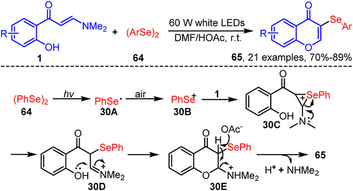 In 2021, Zhou and colleagues reported a practical visible-light-driven tandem selenylation-cyclization reaction of o-hydroxyaryl enaminones 1 and diselenides 64, resulting in the construction of 3-selenylated chromones 65 (Scheme 30) [99]. This reaction utilizes environmentally friendly molecular as an oxidant and does not require photocatalysts or additional additives, although only diaryl diselenides 64 are compatible with the system. The reaction mechanism begins with the homolytic cleavage of diselenides 64 under light irradiation to generate selenium radicals 30A, which are subsequently oxidized by atmospheric oxygen to form selenium cations 30B. These cations then react with enaminones 1 to produce selenonium ion 30C. This intermediate undergoes intramolecular electrophilic ring-opening and nucleophilic cyclization, proceeding through intermediate 30D to form intermediate 30E. Finally, 30E undergoes deprotonation and elimination of dimethylamine to produce the target product 65.
