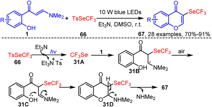 In 2022, Wu's group developed a practical and green method using TsSeCF3 66 as a trifluoromethylselenylation reagent to achieve the tandem vinyl α-C-H bond trifluoromethylselenylation and cyclization of o-hydroxyaryl enaminones 1 under visible light irradiation (Scheme 31) [100]. This reaction proceeds without the need for photocatalysts or additional oxidants and demonstrates good functional group compatibility with substrates. Initially, the TsSeCF3 66 generates a trifluoromethylselenyl radical 31A under light irradiation and with the assistance of Et3N. This radical undergoes electrophilic addition to enaminones 1, followed by single-electron oxidation by oxygen, resulting in the formation of the imine intermediate 31C via the radical intermediate 31B. Finally, 31C undergoes intramolecular nucleophilic cyclization, deprotonation, and demethylamination, resulting in the formation of the 3-trifluoromethylselenylated chromone 67.