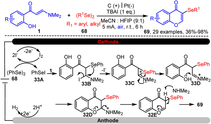 Recently, Cai et al. confirmed the electrochemical tandem vinyl α-C-H bond selenylation/cyclization of o-hydroxyaryl enaminones 1, employing diselenides 68 as selenylation reagents to construct 3-selenylated chromones 69 (Scheme 33) [102]. Notably, various selenylation reagents such as diaryl diselenides, dialkyl diselenides, and diheteroaryl diselenides successfully yielded the desired products. Furthermore, diaryl disulfides 52 were also compatible with this reaction system, efficiently producing 3-arylthiochromone derivatives 53 with excellent yields. A plausible reaction mechanism is proposed, as illustrated in Scheme 33. Initially, iodide ions are oxidized to iodine at the anode, which then reacts with diselenides 68 to generate intermediate 33A. Intermediate 33A undergoes electrophilic addition to the enaminones 1, forming intermediate 33B, which subsequently undergoes intramolecular SN2-type nucleophilic substitution to produce selenonium ion 33C. Following this, 33C undergoes electrophilic ring-opening and intramolecular nucleophilic cyclization, passing through imine intermediate 33D to form intermediate 32D. Finally, 32D undergoes demethylamination and deprotonation, proceeding through intermediate 32E to yield the final product 69.
