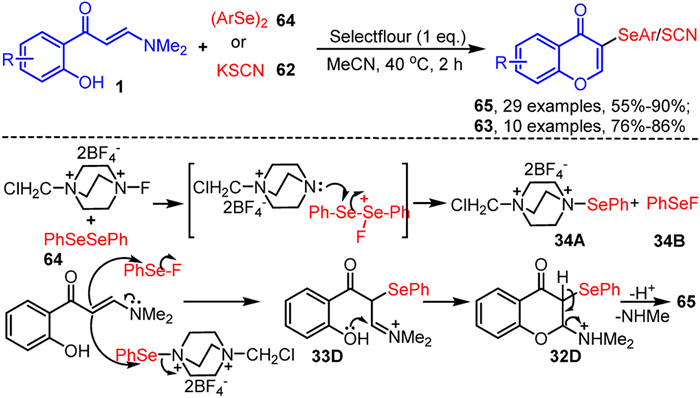 Interestingly, the Yuan's group developed an efficient method for the synthesis of 3-selenylated chromones 65 and 3-thiocyanated chromones 63 using a Selectfluor-mediated oxidation strategy, with diaryl diselenides 64 as selenylation agents and KSCN 62 as the thiocyanation agent (Scheme 34) [103]. This reaction demonstrates a broad substrate scope and proceeds under mild conditions. Mechanistic studies propose a plausible tandem selenylation and cyclization pathway for the formation of 3-selenylated chromones 65. As shown in Scheme 34, the reaction of diaryl diselenides 64 with Selectfluor generates two potential electrophilic selenium intermediates, 34A and 34B. Subsequent nucleophilic addition of enaminones 1 to either intermediate 34A or 34B produces imine intermediate 33D. This intermediate undergoes intramolecular nucleophilic cyclization, deprotonation, and demethylamination, proceeding through intermediate 32D, to afford the final product 65.