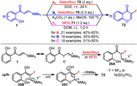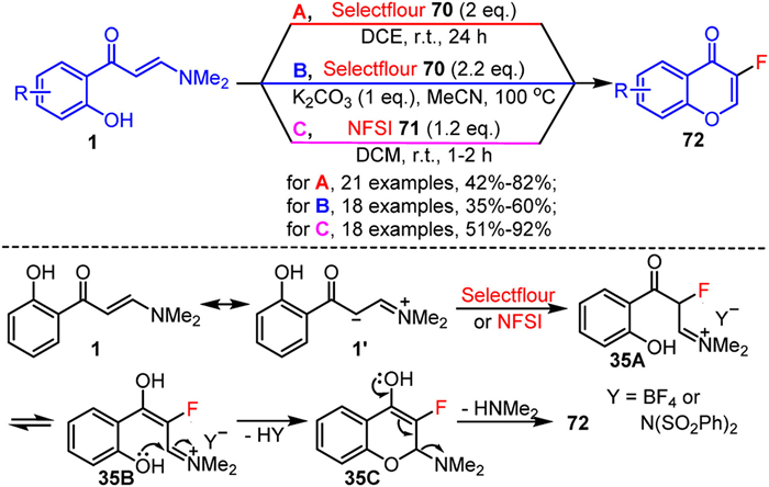 In recent years, the Behera group (Scheme 35A) [109] and the Yu group (Scheme 35B) [110] have successfully synthesized 3-fluorinated chromone derivatives 72 under mild conditions using Selectfluor 70 as the electrophilic fluorination reagent. Additionally, the Akkineni group (Scheme 35C) [111] utilized NFSI (N-fluorobenzenesulfonimide) 71 as the electrophilic fluorination reagent to achieve an efficient cascade fluorination-cyclization reaction of o-hydroxyaryl enaminones 1, resulting in the synthesis of 3-fluorochromones 72. These reactions proceed through a similar mechanistic pathway, as illustrated in Scheme 35. Initially, enaminone 1 is converted to the resonance-limited form 1′, which then reacts with the electrophilic fluorination reagent (Selectfluor 70 or NFSI 71) to form the zwitterionic intermediate 35A. This intermediate undergoes keto-enol tautomerism to produce intermediate 35B, which then undergoes conventional chromone cyclization, deprotonation, and dimethylamine elimination to yield the target molecule 72 via intermediate 35C.