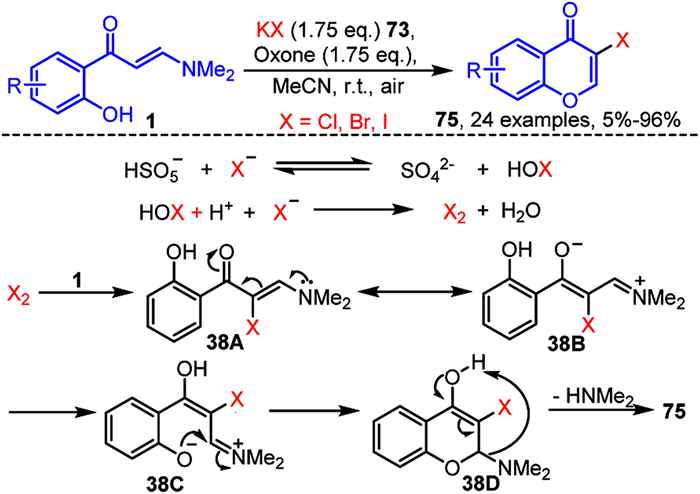 In 2024, Coelho and colleagues developed a streamlined and efficient tandem α-halogenation/cyclization reaction of o-hydroxyaryl enaminones 1 for synthesizing 3-halochromones 75 (X = Cl, Br, I) by employing KX 73 in combination with Oxone as the reagent system (Scheme 38) [115]. This reaction pathway offers a straightforward, operationally simple approach for accessing 3-halochromones 75. Mechanistic investigations reveal that the halide anions from KX are initially oxidized to X2 in the presence of Oxone. The X2 subsequently interacts with enaminone 1 to form intermediate 38A, which resonates to produce 38B. Following an intramolecular proton transfer, 38B is converted to intermediate 38C. This intermediate then undergoes an intramolecular nucleophilic cyclization to yield intermediate 38D, which finally eliminates dimethylamine to generate the target 3-halogenated chromone 75.