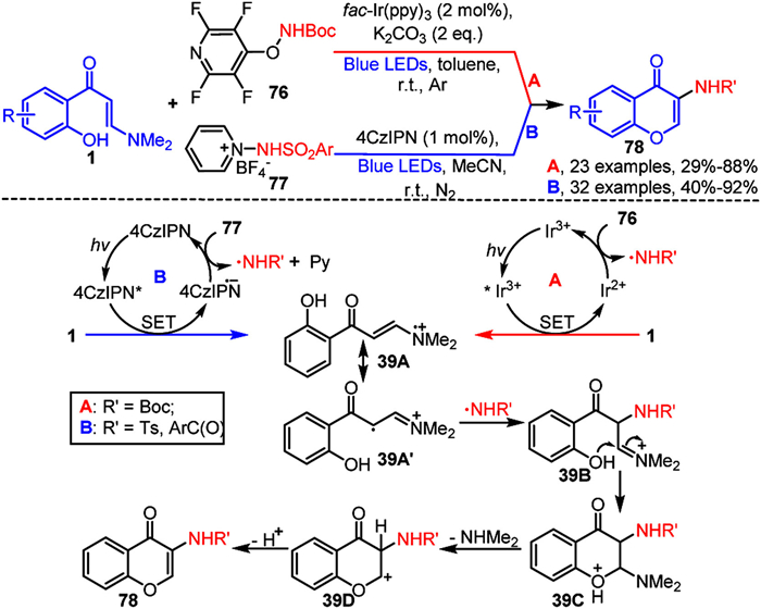 5.1. Synthesis of 3-aminated chromonesRecently, Yang and Zhang et al. reported innovative methods for synthesizing structurally diverse 3-aminated chromones 78 through photocatalytic tandem amidation-cyclization reactions of o-hydroxyaryl enaminones 1. Yang et al. utilized tert-butyl ((perfluoropyridin-4-yl)oxy)carbamate 76 (Scheme 39A) [116], while Zhang et al. employed N-aminopyridinium salts 77 (Scheme 39B) [117] as precursors for amidyl radicals. Mechanistic investigations confirmed that these reactions involve amidyl radical intermediates, as depicted in Scheme 39. Under visible light irradiation, photocatalysts Ir3+ and 4CzIPN are excited to their respective states *Ir3+ and 4CzIPN*. These excited states then reduce and quench enaminone 1 via a single-electron transfer (SET) process, forming intermediates Ir2+ and 4CzIPN radical anion, while simultaneously generating nitrogen-centered radical 39A. Subsequently, photocatalysts Ir2+ and 4CzIPN radical anion oxidize amidyl radical precursors 76 and 77 to yield the corresponding amidyl radicals. Concurrently, the carbon-centered radical 39A', originating from nitrogen-centered radical 39A through resonance stabilization, engages in radical coupling with the amidyl radicals to produce the iminium ion intermediate 39B. The final stage involves intramolecular nucleophilic cyclization of intermediate 39B, followed by the elimination of dimethylamine and deprotonation, ultimately yielding the desired products 78.