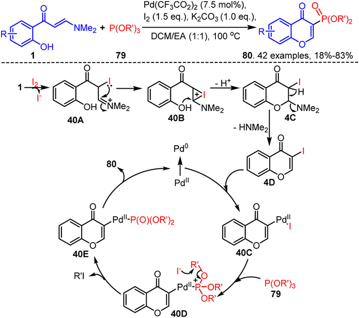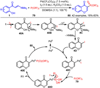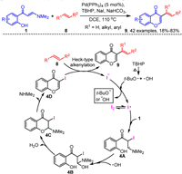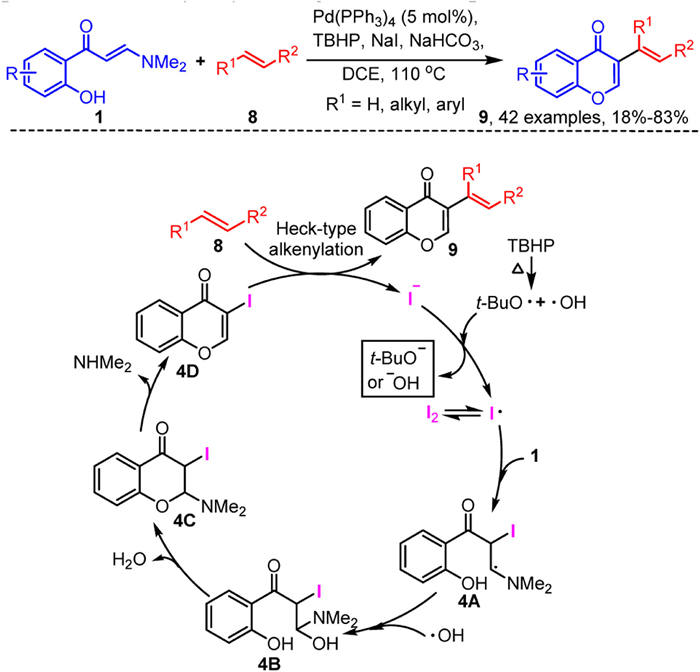 In 2020, our group developed a palladium-catalyzed NaI-mediated one-pot domino vinyl α-C-H alkenylation and chromone annulation of o-hydroxyaryl enaminones 1 with alkenes 8 toward 3-vinyl chromones 9 (Scheme 4) [60]. The reaction exhibits good compatibility with the functional groups in enaminones 1, and both terminal and internal alkenes are well accommodated by the reaction system, resulting in the formation of the desired 3-alkenylated chromones 9 with moderate to excellent yields. Notably, this reaction system is also applicable for the modification of natural products containing double bonds. Furthermore, the iodine source in the reaction system is crucial for the reaction to proceed smoothly. Control experiments indicate that the reaction likely proceeds through a transient iodination process. Initially, in the presence of TBHP, the iodine ion is oxidized to iodine radical via a single-electron transfer. Subsequently, the iodine radical adds to the C=C bond in enaminones 1 to form intermediate 4A, which couples with a hydroxyl radical to yield intermediate 4B. Intermediate 4B undergoes cyclization and dehydration to generate intermediate 4C, which subsequently eliminates the dimethylamine to produce 3-iodochromone 4D. Finally, intermediate 4D undergoes a Heck-type coupling reaction with the alkenes 8 in the presence of a palladium catalyst, yielding the desired product 9.
