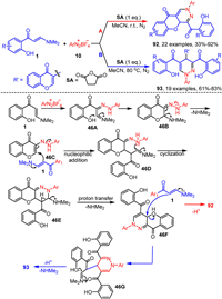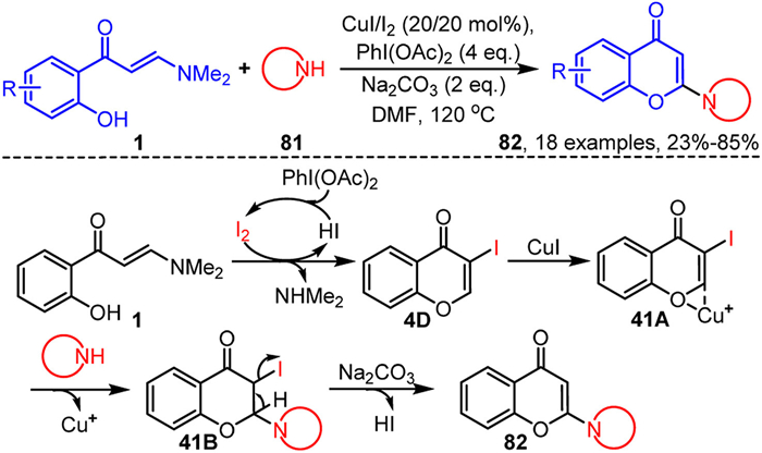 In 2024, the Anand group pioneered a CuI-catalyzed tandem cyclization of 2-(2-alkynyl)pyridines 38 with o-hydroxyaryl enaminones 1, presenting a novel and efficient pathway for constructing bioactive heterocyclic-substituted 3-alkylchromones 39 (Scheme 17) [78]. This reaction mechanism begins with CuI-mediated activation of the carbon-carbon triple bond in 2-(2-alkynyl)pyridine 38, forming intermediate 17A, which undergoes a 5-endo-dig cyclization to produce intermediate 17B. From this point, intermediate 17B may proceed via two mechanistic pathways to form product 39: In Pathway A, nucleophilic addition between the enaminone 1 and the exocyclic double bond of intermediate 17B generates intermediate 17C, followed by an intramolecular nucleophilic cyclization, yielding intermediate 17D. Subsequent elimination of a dimethylamine cation and copper metal from 17D leads to the target product 39. In Pathway B, enaminone 1 undergoes intramolecular cyclization facilitated by CuI, forming intermediate 17F. This intermediate then undergoes nucleophilic addition with the exocyclic double bond of intermediate 17B to form 17 G, which upon dimethylamine elimination and demetalation, yields the final product 39.