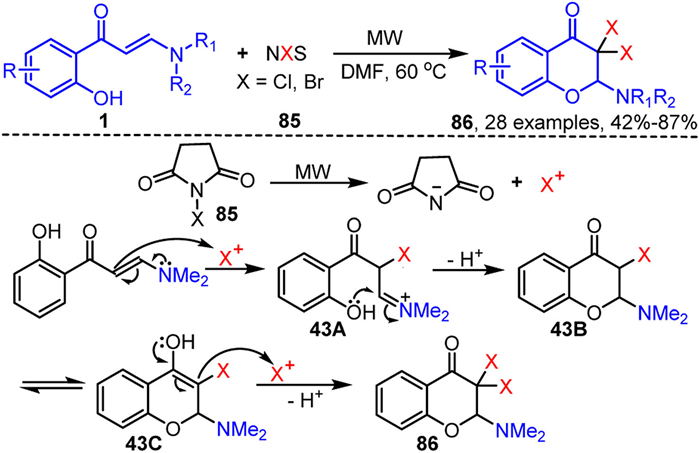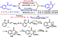 In recent years, our group has focused on the chemistry of enaminones and developed several methodologies for the synthesis of 3-halogenated chromone derivatives 75. Specifically, we utilized inexpensive and readily available inorganic potassium halide 73 (Scheme 37A) [113] and sodium halide 74 (Scheme 37B) [114] as halogenating agents. By employing PhI(OAc)2 oxidation and electrochemical oxidation strategies, we achieved the synthesis of highly chemoselective 3-halogenated chromone derivatives 75. These methods offer mild reaction conditions, a broad substrate scope, and avoid the use of environmentally harmful elemental halogens. Mechanistic investigations suggest that these strategies follow the pathways illustrated in Scheme 37. Initially, halide anions are oxidized by either iodobenzene diacetate or the anode of an electrochemical cell to form the corresponding halogen species. Subsequently, the resonance form 1′ of enaminone 1 undergoes nucleophilic substitution with the halogen species, yielding the halogenated iminium ion 37A. This intermediate then undergoes intramolecular nucleophilic attack to form the halonium ion 37B, which then undergoes intramolecular nucleophilic ring-opening and deprotonation to yield intermediate 37C. Finally, intermediate 37C loses dimethylamine to afford the desired product 75. It is noteworthy that the PhI(OAc)2 oxidation system is ineffective for the synthesis of 3-chlorochromones, likely due to the insufficient oxidative power of PhI(OAc)2 to convert chloride ions into chlorine.