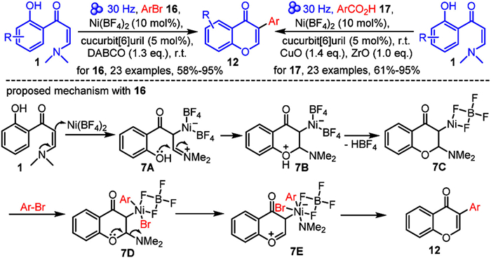 Recently, the same group described the efficient synthesis of 3-arylated chromones by combining mechanochemical methods with nickel catalysis, utilizing aryl bromides 16 and aryl carboxylic acids 17 as arylation agents (Scheme 7) [63]. This reaction represents the first application of mechanical energy in the synthesis of 3-arylated chromones 12. Based on control experiments and theoretical calculations, a plausible reaction mechanism involving aryl bromide 16 as the arylation agent has been proposed. Initially, o-hydroxyaryl enaminones 1 coordinates with the nickel catalyst to form intermediate 7A. Subsequently, 7A undergoes intramolecular nucleophilic cyclization and loses a molecule of HBF4 to yield intermediate 7C. Next, oxidative addition of aryl bromide to 7C forms intermediate 7D. Finally, 7D undergoes intramolecular dimethylamino transfer and elimination, resulting in the final products 12.