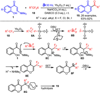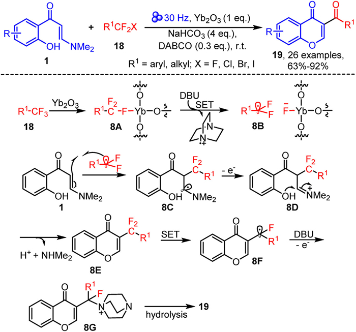 In 2023, Mkrtchyan and Iaroshenko et al. developed a mechanochemical synthesis strategy utilizing halogenated difluoromethyl compounds 18 as acylating agents to achieve a tandem acylation-cyclization reaction of o-hydroxyaryl enaminones 1, efficiently constructing a diverse array of 3-acylated chromone derivatives 19 [64]. Notably, this reaction involves the activation of the inert C-F bond in halogenated difluoromethyl compounds by Yb₂O₃, enabling defluorination and conversion into the corresponding carbonyl functional groups. The reaction also demonstrates good substrate compatibility, accommodating both aryl and alkyl halogenated difluoromethyl compounds. Based on control experiments and density functional theory (DFT) calculations, a plausible reaction mechanism was proposed. As shown in Scheme 8, under ball-milling conditions, Yb₂O₃ first activates the C-F bond in trifluoromethyl compounds 18 to form intermediate 8A, which is then reduced by DBU via single-electron transfer, generating radical intermediate 8B. Subsequently, 8B undergoes radical addition with enaminone 1, forming intermediate 8C, which is oxidized to iminium ion 8D through single-electron oxidation. Next, 8D undergoes intramolecular nucleophilic cyclization, with the elimination of a proton and dimethylamine, yielding the 3-difluoro-substituted chromone intermediate 8E. Intermediate 8E then undergoes single-electron reduction and defluorination to generate radical intermediate 8F. Radical intermediate 8F reacts with DBU, loses an electron to form intermediate 8G, which finally undergoes hydrolysis to produce the final product 19.