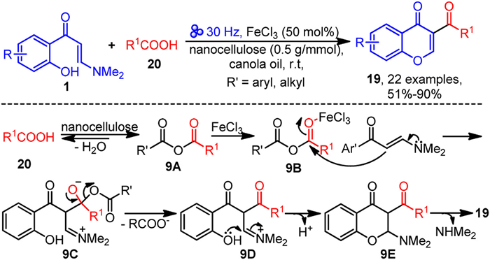 In the same year, the same group established a mechanochemical strategy for the efficient preparation of 3-acylated chromones 19 via tandem acylation and cyclization of o-hydroxyaryl enaminones 1 (Scheme 9) [65]. This method utilizes inexpensive and readily available carboxylic acids 20 as acylation reagents and nanocellulose as the reaction medium, with FeCl3 acting as a promoter. A key advantage of this strategy is that it does not require oxidants or solvents, and accommodates a broad range of substrates, effectively supporting both aryl and alkyl carboxylic acids. Notably, nanocellulose serves dual functions in this system: as a reaction medium and as a dehydrating agent that promotes the self-dehydration condensation of carboxylic acids. Based on experimental results, a plausible reaction mechanism for the tandem dehydration-acylation-cyclization of enaminone 1 is proposed. Initially, carboxylic acids 20 undergo self-dehydration condensation to form anhydride 9A in the presence of nanocellulose. The carbonyl group in 9A coordinates with FeCl3, increasing the electrophilicity of the carbonyl and forming intermediate 9B. Subsequently, the enaminone 1 initiates a nucleophilic attack on the carbonyl of 9B, resulting in the formation of zwitterionic intermediate 9C, which then decarboxylates to yield iminium ion 9D. Finally, 9D undergoes intramolecular nucleophilic cyclization, followed by deprotonation and dimethylamine elimination through intermediate 9E, to afford the final product 19.